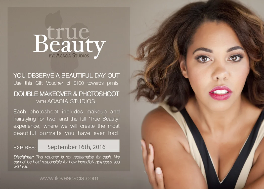 The "True Beauty" experience is a 3 hour session that enables us to capture your "true beauty". It is a relaxing makeup session, followed by a slow paced magazine/Vanity Fair style photo shoot. In this session, you will learn how to look best in photos, and learn tips and techniques on how to relax in front of the camera to display the "authentic" beauty that you are!